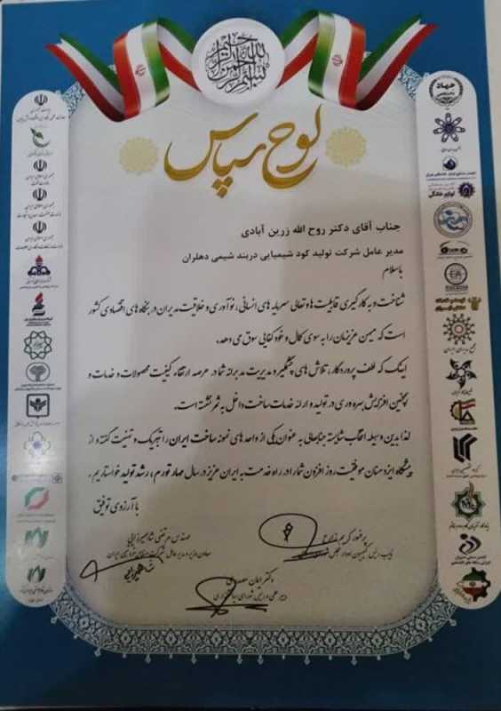 بازتاب ایلام/در همایش{ساخت ایران} که در تهران برگزار شد، شرکت دربندشیمی دهلران که در زمینه تولید کودهای شیمیایی فعالیت دارد، بعنوان واحد نمونه شناخته شد و از روح الله زرین آبادی مدیرعامل این شرکت با اهداء لوح تقدیر تجلیل به عمل آمد.