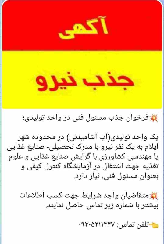 یک واحد تولیدی(آب آشامیدنی) در محدوده شهر ایلام به یک نفر نیرو با مدرک تحصیلی- صنایع غذایی یا مهندسی کشاورزی با گرایش صنایع غذایی و علوم تغذیه جهت اشتغال در آزمایشگاه کنترل کیفی و بعنوان مسئول فنی، نیاز دارد.