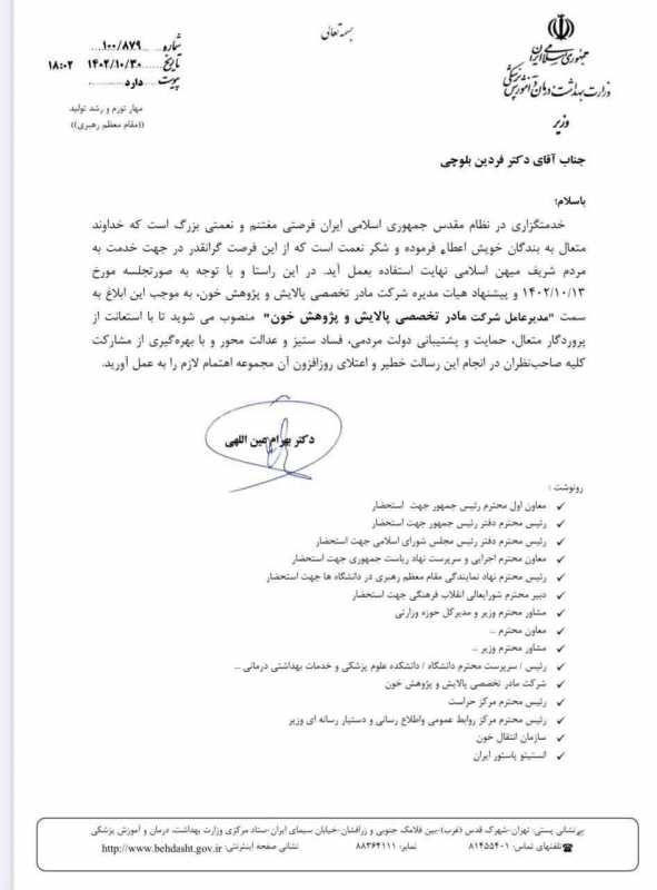 بازتاب ایلام/طی حکمی از سوی دکتر بهرام عین اللهی وزیر بهداشت، درمان و آموزش پزشکی؛ دکتر فردین بلوچی به عنوان مدیرعامل شرکت مادر تخصصی پالایش و پژوهش خون منصوب شد.
