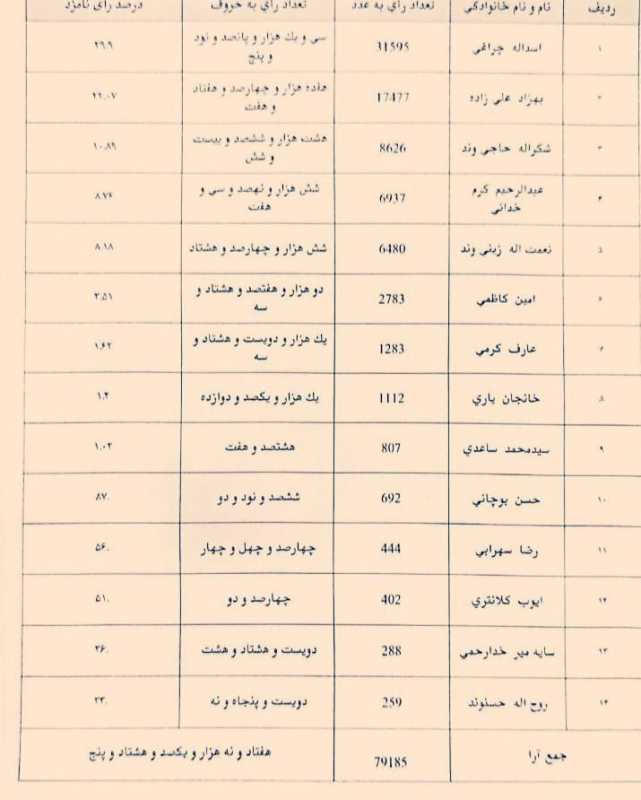 وی با بیان اینکه چراغی توانست ۴۰ درصد از کل آرای ماخوذه را از آن خود کند، افزود: کل آرای ماخوذه در این حوزه انتخابیه ۷۹ هزار و ۱۸۵ رای بوده است.