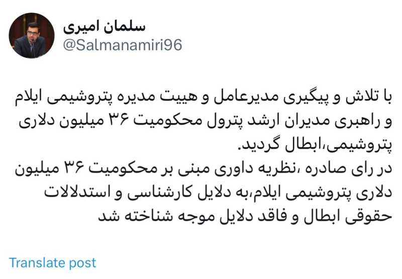 بازتاب ایلام/با تلاش و پیگیری مدیرعامل و هیئت مدیره پتروشیمی ایلام و راهبری مدیران ارشد پترول؛ محکومیت ۳۶ میلیون دلاری پتروشیمی ایلام ابطال گردید.
