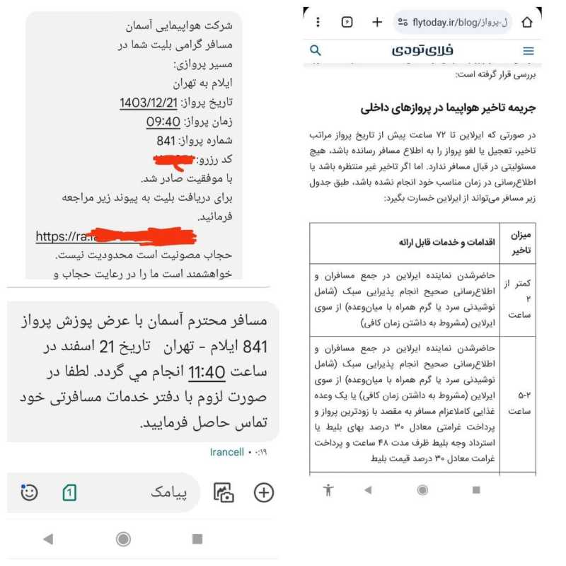برای لغو بلیت پرواز و استرداد وجه با شرکت مربوطه تماس گرفتم و اعلام داشتند که باید ۶۰ درصد مبلغ بلیت جریمه شوید و تنها ۴۰ رصد مبلغ واریزی باز گردانده می‌شود در صورتی که اولاً اطلاع‌رسانی تأخیر ۱۲ ساعت قبل از پرواز انجام شده است و اینجانب سریعاً برای کنسل کردن بلیت اقدام نمودم. ثانیاً برابر دستورالعمل، باید بخاطر تأخیر دو ساعته نه تنها باید کل مبلغ بلیت را استرداد کنند بلکه ۳۰ درصد هم غرامت بدهند نه اینکه بنده را ۶۰ درصد مبلغ بليت، جریمه کنند.