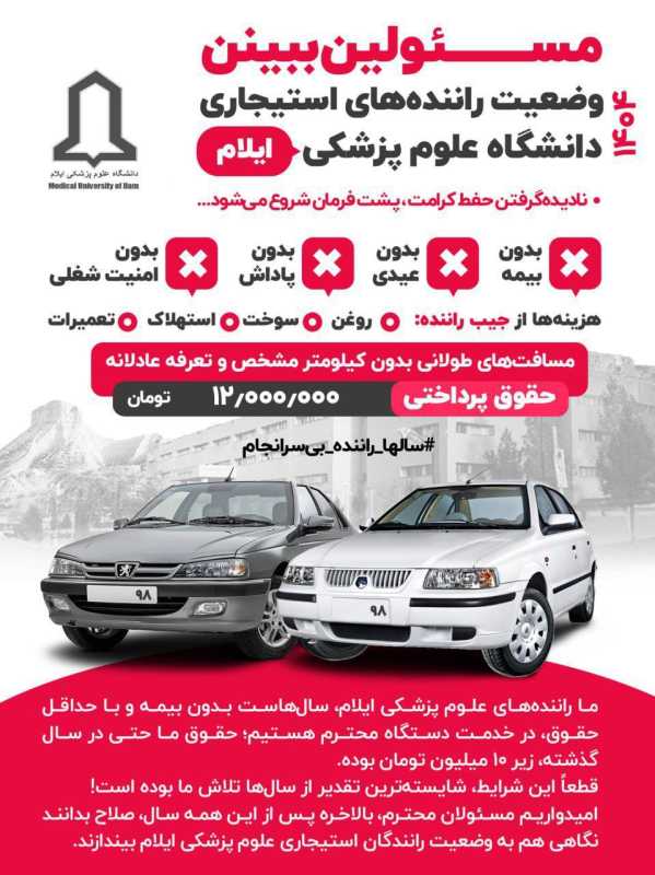 یکی از رانندگان استیجاری دانشگاه علوم پزشکی ایلام هستم. سال‌هاست بدون بیمه و با ماشین شخصی خودمان در خدمت دانشگاه علوم پزشکی هستیم. حقوق‌مان پارسال حتی زیر ۱۰ میلیون تومان بود.