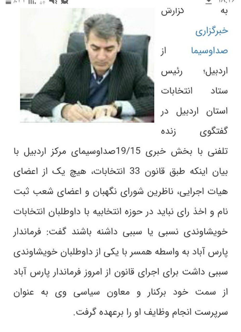 طبق ماده ۳۳ قانون انتخابات؛ "محمدنژاد" به عنوان مجری انتخابات در این شهرستان، به دلیل داشتن نسبت سببی با کاندیدای مجلس"شادمهر کاظم زاده" بایستی از سمت خود استعفاء دهد یا برکنار شود.!