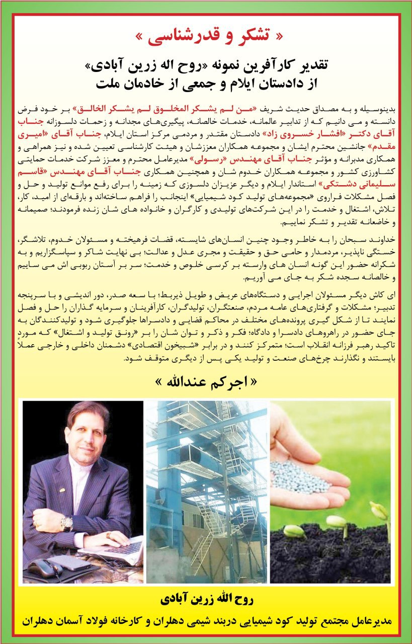 بازتاب ایلام-"روح الله زرین آبادی" کارآفرین و تولید کننده نمونه؛ به پاس خدمات و توجهات دادستان ایلام و جمعی از مدیران و مسئولان که زمینه را برای "رفع موانع تولید و اشتغال" در مجموعه های تحت تصدی اش؛ فراهم ساخته اند، مراتب"تقدیر و قدرشناسی" خود را ابراز داشت.