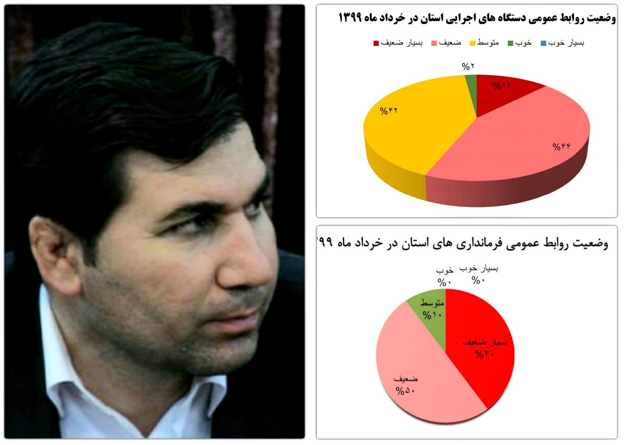 وی تاکید کرد: در خصوص ارزیابی روابط عمومی فرمانداری های استان در خرداد ماه گفت: از ۱۰ فرمانداری که مورد در ارزیابی قرار گرفته است ۴ فرمانداری وضعیت بسیار ضعیف، ۵ فرمانداری وضعیت ضعیف و یک فرمانداری وضعیت متوسط داشته است و یک فرمانداری هم بنا به درخواست فرماندار مربوطه به خاطر تازه تاسیس بودن و عدم وجود زیرساخت های لازم از حوزه ارزیابی خارج شده است.