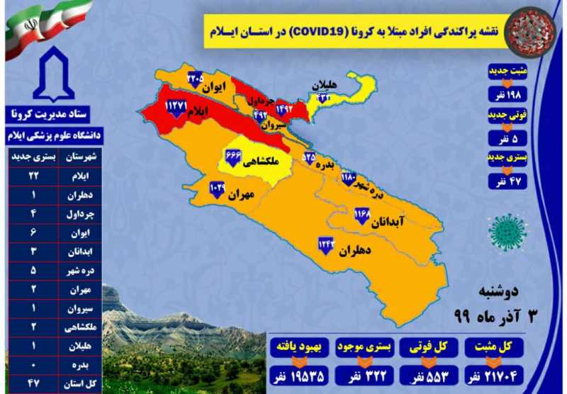 گفتنی است؛ از ۵ مورد فوتی امروز، ۳ مورد مربوط به شهرستان ایلام، یک مورد ملکشاهی و یک مورد سیروان می باشد.