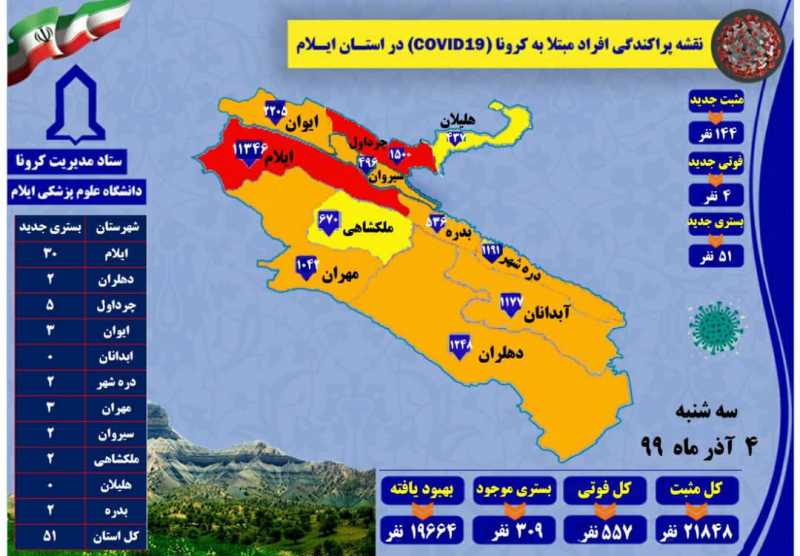 گفتنی است؛ از ۴ مورد فوتی امروز، ۲ مورد مربوط به شهرستان ایلام، ۱ مورد چرداول و ۱ مورد ایوان می باشد.