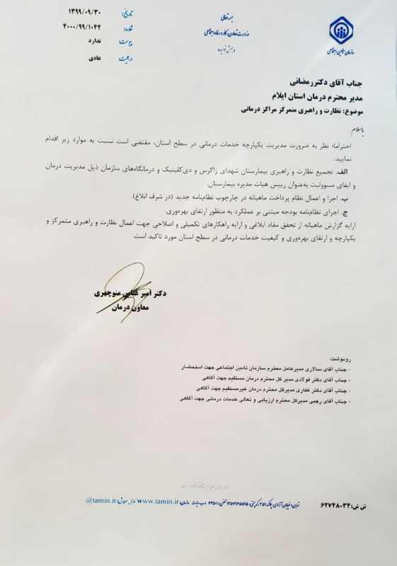 طی نامه امروز(یکشنبه ۳۰ آذر ماه) "دکتر منوچهری" معاون درمان سازمان تامین اجتماعی خطاب به "دکتر رمضانی" مدیر درمان تامین اجتماعی استان ایلام؛ نظارت و راهبری بیمارستان شهدای زاگرس به ایشان محول گردیده و به عنوان رئیس هیئت مدیره بیمارستان مذکور، مسئولیت پیگیری و انجام اقدامات تکمیلی در راستای حل مشکلات و رفع معضلات این بیمارستان به وی تفويض شده و از این پس بیمارستان شهدای زاگرس در ذیل مجموعه مدیریت درمان تامین اجتماعی ایلام فعالیت خواهد کرد.!