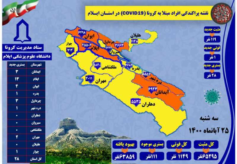 شناسایی ۱۱۹ مورد جدید مبتلا به کرونا ویروس و ثبت یک مورد فوتی در ایلام