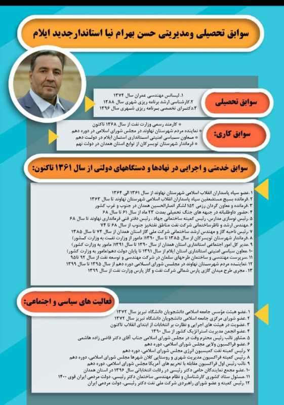«حسن بهرام نیا» در گفتگو با بازتاب ایلام با تقدیر و تشکر از حُسن اعتماد رئیس جمهور و هیئت دولت که زمینه حضور ایشان و خدمتگزاری به مردم سرافراز استان ایلام را فراهم ساخته اند، اظهار داشت: از حمایت نماینده ولی فقیه در استان، نماینده مردم استان در مجلس خبرگان رهبری، نمایندگان مردم در مجلس شورای اسلامی، مردم شریف و نجیب استان و اصحاب مطبوعات و رسانه های دیداری و شنیداری صمیمانه سپاسگزارم و رجاء واثق دارم با توکل به خداوند سبحان و توسل به ائمه اطهار(س) و بعنوان خدمتگزاری شایسته و با حمایت و مشارکت همگانی، زمینه توسعه و پیشرفت استان ایلام «پایتخت زائران اربعین حسینی» را مهیا سازیم.