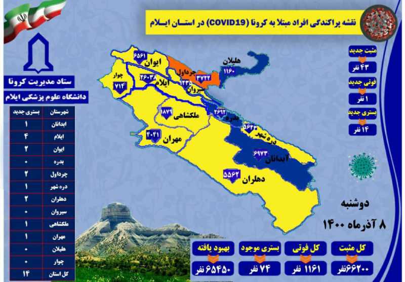 شناسایی ۴۳ مورد جدید مبتلا به کرونا ویروس و ثبت یک مورد فوتی در ایلام