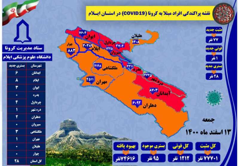 شناسایی ۷۷ مورد جدید مبتلا به کرونا ویروس و ثبت یک مورد فوتی در ایلام