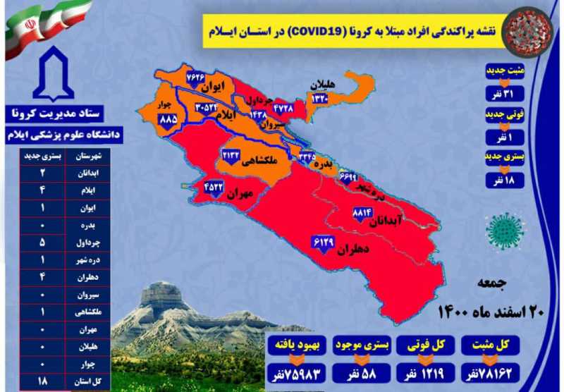 شناسایی ۳۱ مورد جدید مبتلا به کرونا ویروس و ثبت یک مورد فوتی در ایلام