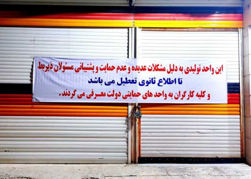 با توجه به عدم حمایت و پشتیبانی مسئولان ذیربط طی سه سال اخیر و عدم پیگیری مشکلات این واحد تولیدی علی رغم مکاتبات و جلسات مکرر و مختلف؛ این واحد تولیدی تا اطلاع ثانوی تعطیل و کارگران به واحد های حمایتی دولت معرفی می شوند.