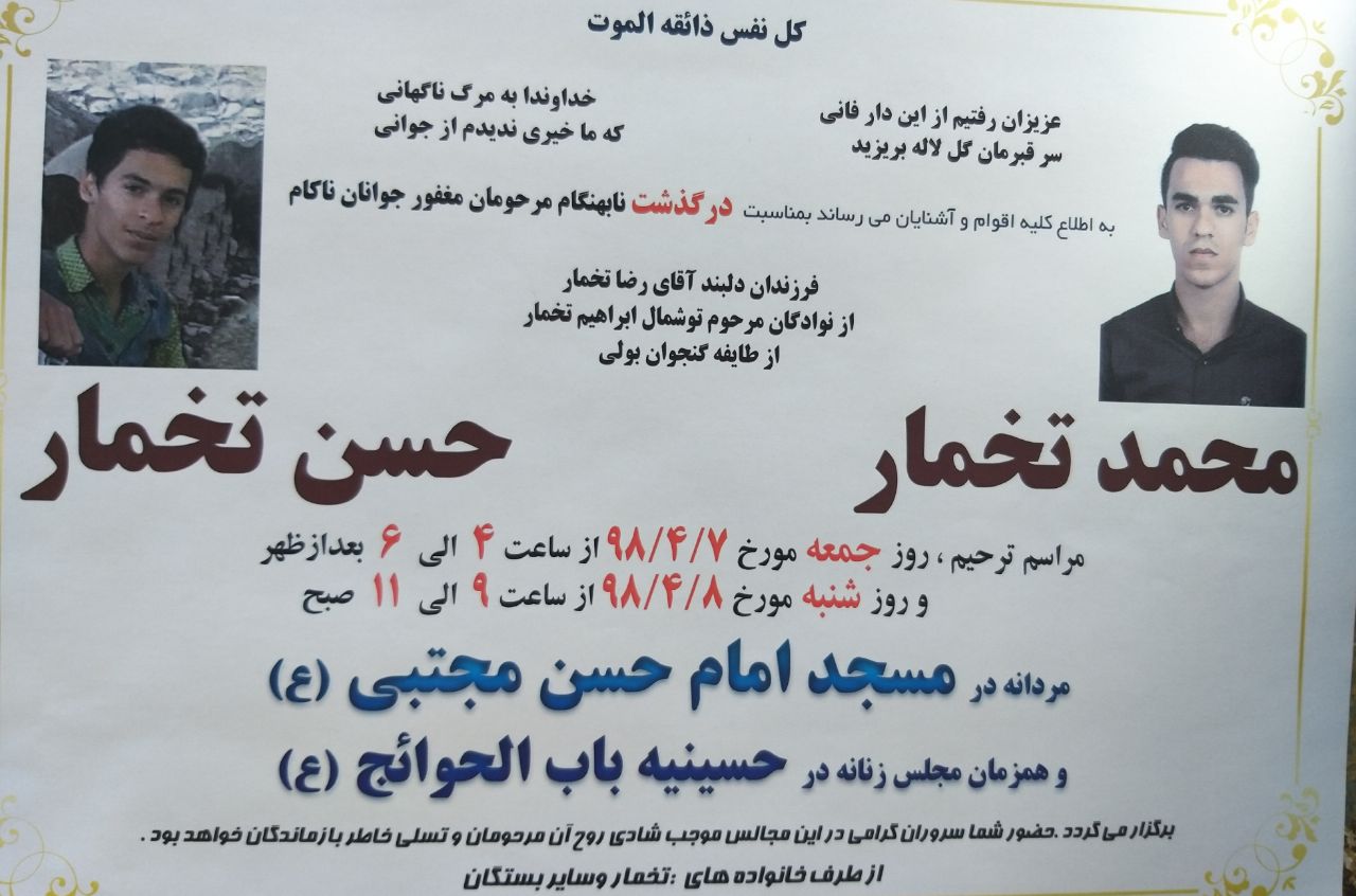 دیروز در ناگهان ترین و تلخ ترین حادثه، دو برادر جوان زنده یادها"محمد تخمار ۲۳ ساله" و "حسن تخمار ۱۶ ساله" در یکی از حوضچه های طبیعی کوهستان های اطراف گنجوان موسوم به " چولاندر"، غرق شدند و خانواده های شان را غرق سوگواری و ماتم کرد.