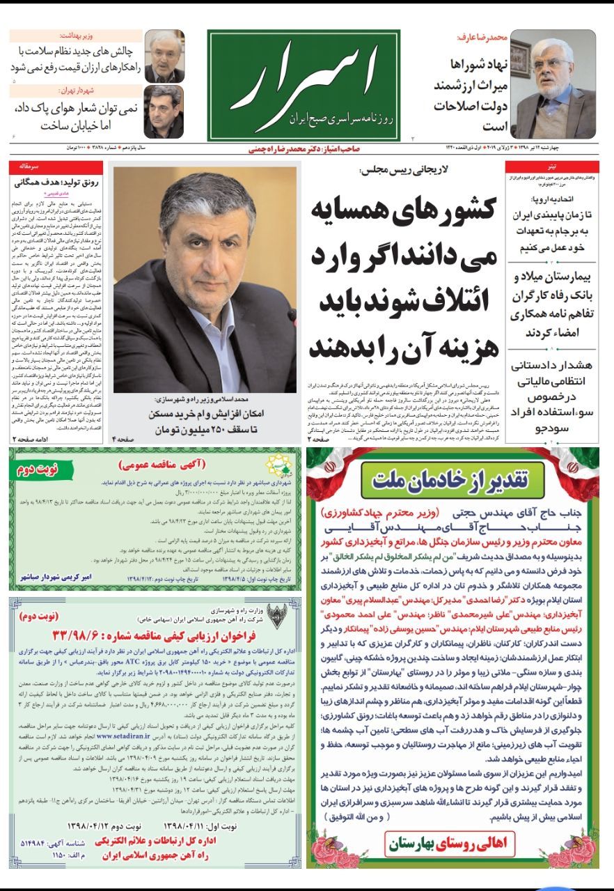 این "قدرشناسی و سپاسگزاری" دیروز چهارشنبه ۹۸/۰۴/۱۲ در صفحه اول روزنامه سراسری "اسرار" چاپ و در سراسر کشور منتشر شده است.!