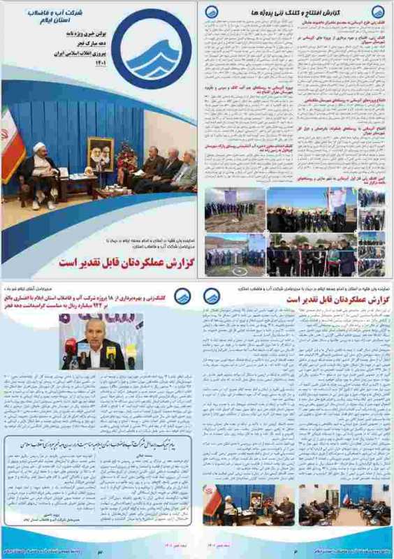 بازتاب ایلام/مهندس پرویز ناصری مدیرعامل شرکت آب و فاضلاب استان ایلام به میمنت دهه مبارک فجر، اهم فعالیتها و اقدامات شرکت آب و فاضلاب در استان ایلام را به شرح ذیل تشریح کرد: